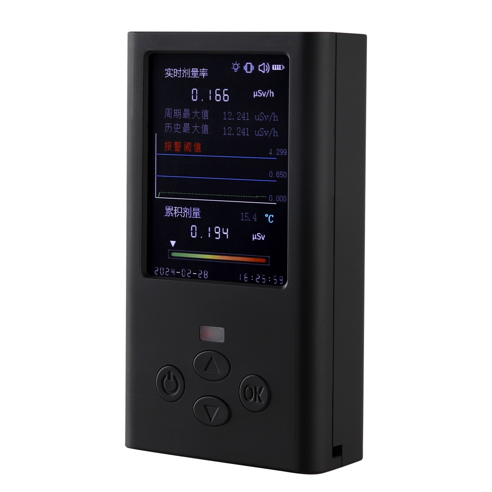 設備儀器采用高亮度2.4寸真彩觸摸屏,操作簡單易上手,同時顯示劑量率、累積劑量、環(huán)境溫度、輻射危險度、輻射峰值和顯示實時時鐘